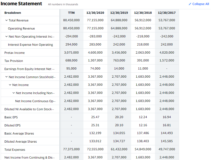 HUMANA 손익계산서 휴매나 역시 지속적으로 연간 매출이 증가하고 있으나, Amedisys와는 다르게 주가 그래프가 지난 5년간 우상향 곡선을 그리고 있습니다.