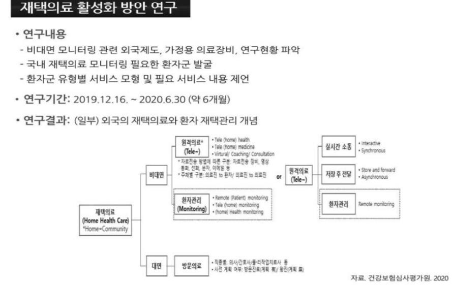 재택의료는 대면 의료인 방문의료와 비대면 의료인 원격의료로 나눌 수 있습니다.