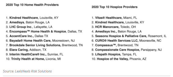 https://homehealthcarenews.com/2021/02/the-top-10-largest-home-health-hospice-providers-in-2020/ (Amedisys가 Hospice Provider 7위인 Compassus 사를 인수합병하였으나 위 표에는 표기되어 있지 않습니다.)