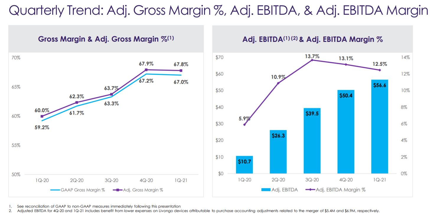 TDOC 1Q-21 Quarterly Results 그러나 해당 기업은 Operating expense가 증가하면서 21년 상반기에 Net loss가 증가하였습니다만, 이것은 부채 상환 그리고 공격적인 M&A 이후, 기술적인 문제점들을 해결해 나가면서 발생하는 Techonology & Development cost, 그리고 무형자산 감가상각비의 증가에 따른 것으로 보입니다. 규모의 경제 측면에서 네트워크 통합과 같은 기술적인 문제들이 개선되면, 점점 수익률이 증가하는 모습으로 바뀌어 나갈 것이라고 생각됩니다.